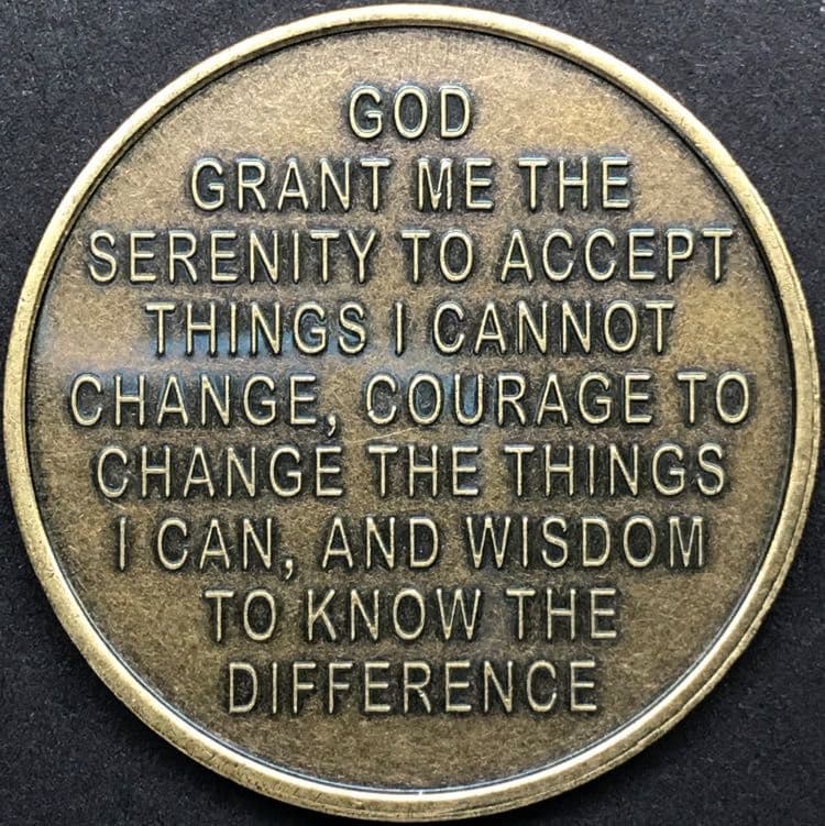 Bronze Medallion with 1 DAY AT A TIME, HONESTY, LOVE, PURITY & UNSELFISHNESS on the front, and the Serenity Prayer on the reverse. Makes a lovely gift or keepsake.