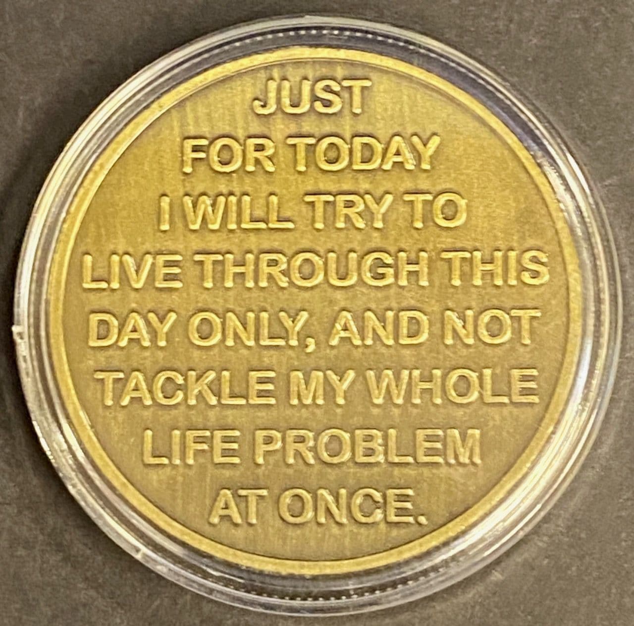 One Day at a Time Sunrise Coin with Just for Today on reverse side. Measuring 40 X 3.2mm Plated Coloured Medallion, weighing 34g presented in it's own case.